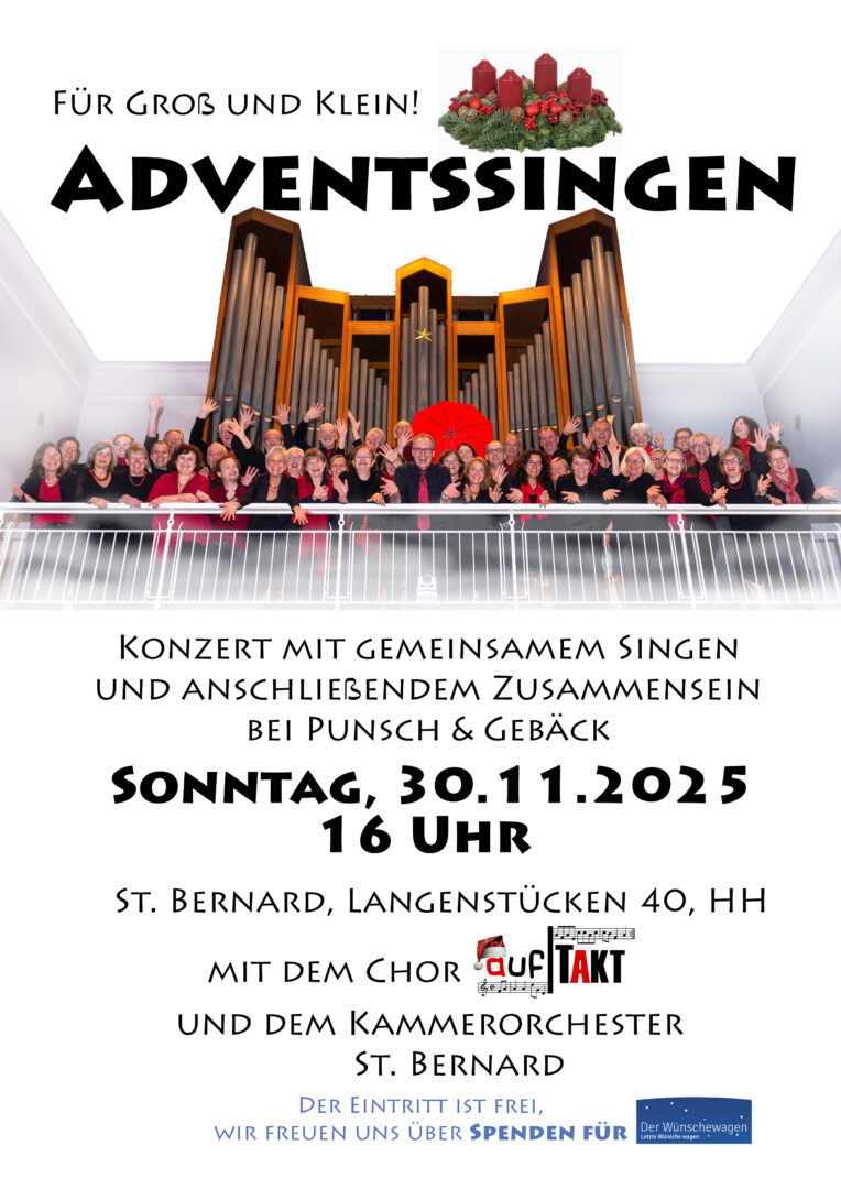 Die Adventszeit ist eine Zeit der Musik, der Besinnung und der Begegnung. Darum laden wir herzlich Groß und Klein zu unserem diesjährigen Adventssingen ein. Gemeinsam wollen wir altbekannte Lieder anstimmen, die uns durch diese besondere Zeit begleiten. Zudem dürfen Sie sich auf einige Vortragsstücke freuen, die vom Chor aufTAKT sowie vom Kammerorchester dargeboten werden.